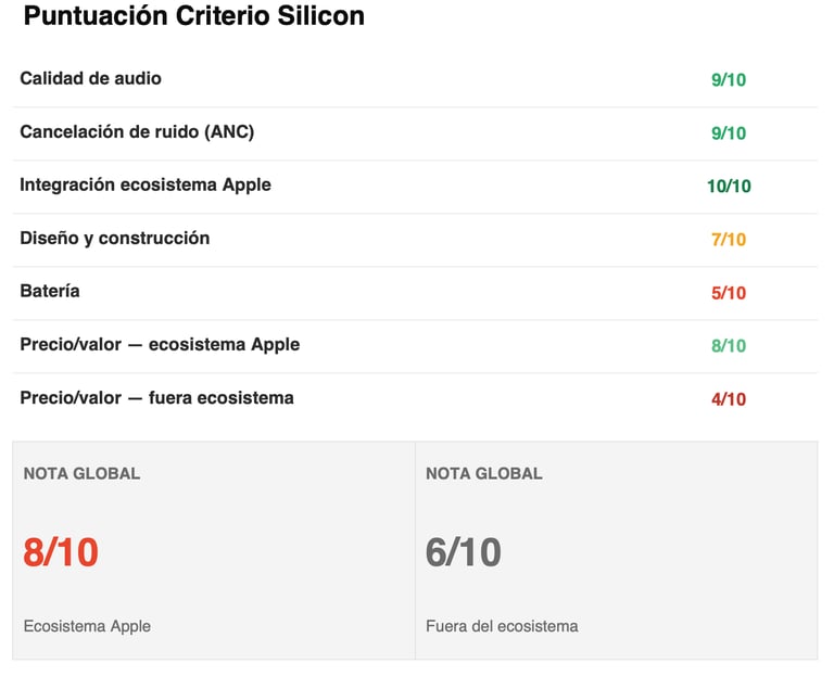 Pero seis años dan para más. La funda sigue siendo un problema sin resolver. La batería no ha avanzado un solo paso. No hay EQ, no hay LDAC, no hay llavero integrado para quien viaje. Apple ha actualizado el cerebro de estos auriculares y ha dejado todo lo demás exactamente igual que en 2020 — incluyendo las cosas que en 2020 ya eran criticables.